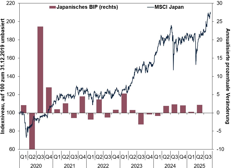 Quelle: FactSet, Stand: 12.09.2025. MSCI Japan, Renditen mit Bruttodividenden, in Yen, 31.12.2019 – 11.09.2025 und japanisches BIP 1. Quartal 2020 – 2. Quartal 2025. Hinweis: Die rechte y-Achse stellt den Rückgang des BIP im zweiten Quartal 2020, der sich auf annualisierter Basis auf 27,1 Prozent belief, verkürzt dar. Wechselkursschwankungen zwischen dem Yen und dem Euro können zu höheren oder niedrigeren Investmentrenditen führen.