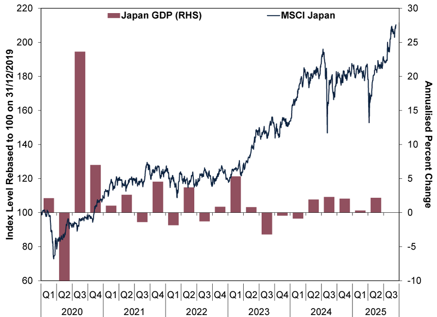 Source: FactSet, as of 12/9/2025. MSCI Japan returns with gross dividends in yen, 31/12/2019 – 11/9/2025, and Japan GDP, Q1 2020 – Q2 2025. Note: Right-hand side y-axis truncates Q2 2020’s GDP decline, which fell -27.1% annualised. Currency fluctuations between the yen and pound may result in higher or lower investment returns.