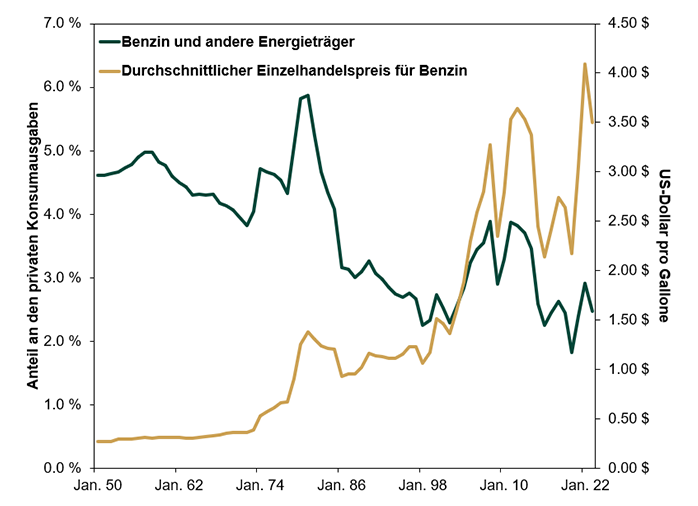 Darstellung 1: Steigende US-Benzinpreise, sinkender Anteil an den Konsumausgaben der US-Verbraucher