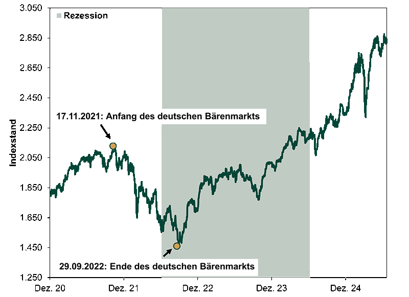 Diese Bestätigung dürfte für die Aktienmärkte, die ja nach vorne blicken, allerdings nichts Neues sein. Wir glauben, dass sie den Abschwung bereits vor seinem Eintreten eingepreist hatten, denn deutsche Aktien durchliefen von Mitte November 2021 bis Ende September 2022 einen Bärenmarkt und verloren dabei 30,7 Prozent – was mit einer erwarteten Konjunkturabschwächung im Einklang stand.[vii] Zum Vergleich: Der MSCI World fiel im gleichen Zeitraum nur um 12,4 Prozent.[viii] Trotz der Rezession, die sich in den beiden Folgejahren abzeichnete, setzte bei deutschen Aktien eine Hausse ein. (Darstellung 1)