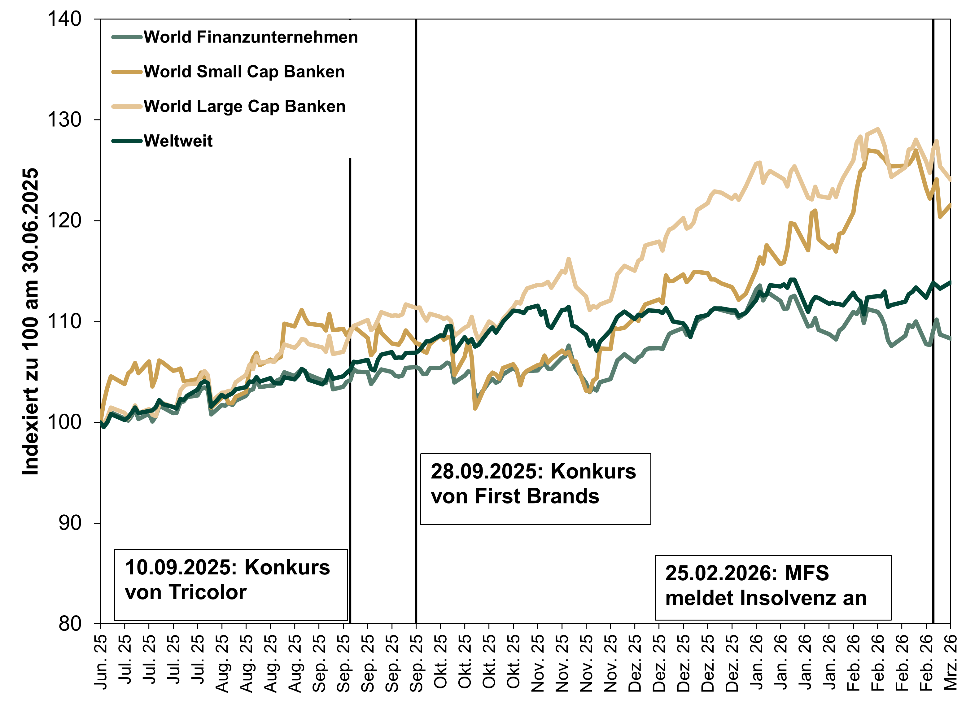 Warnungen vor insolventen Private Credit-Investoren sind nicht neu. Seit dem Konkurs von zwei US-Anbietern im letzten Jahr berichten die von uns verfolgten Finanzpublikationen regelmässig über diese Entwicklungen. Trotz der vielen Berichte über Private Credit sehen wir jedoch keine Anzeichen für grössere systemische Probleme am Markt. Bankkonzerne und kleinere Institute überflügeln seit neun Monaten den Finanzsektor und Aktien weltweit – und zwar ungeachtet der jüngsten Ausfälle im Private Credit-Markt. (Darstellung 1). Mit anderen Worten: Die Unternehmen, die angeblich in einem problembehafteten Marktbereich aktiv sind, schneiden ziemlich gut ab. Sind die jüngsten vorsichtigen Schlagzeilen also übertrieben?