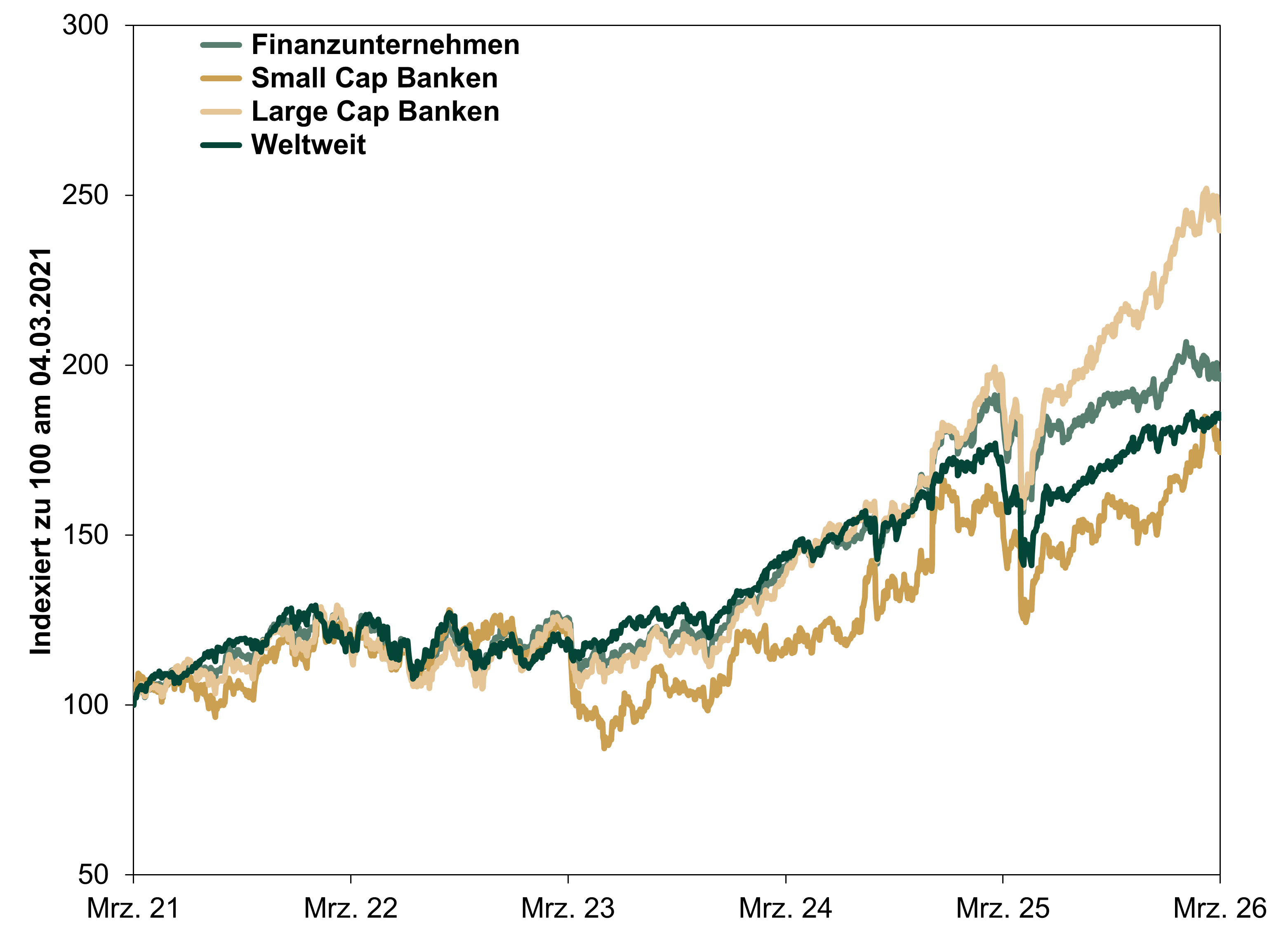 Quelle: FactSet, Stand: 05.03.2026. MSCI World Financials Sector, MSCI World Large Cap Banks, MSCI World Small Cap Banks und MSCI World Index Rendite mit Nettodividenden, 04.03.2021 – 04.03.2026. Indexiert zu 100 am 04.03.2021.