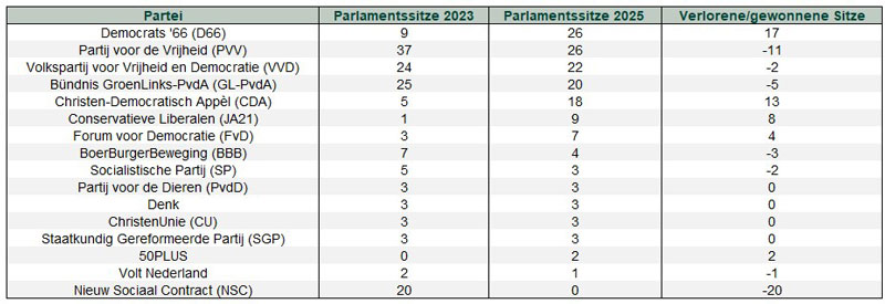 Nachdem nunmehr alle Stimmen ausgezählt sind, entfällt die Mehrheit auf die gemäßigte Democraten 66 (D66) und die rechtspopulistische Partij voor de Vrijheid (PVV) mit jeweils 26 Sitzen im Parlament.[i] Allerdings blieb das Wahlergebnis bis Montagabend unklar, als es der D66 schließlich gelang, die PVV mit den Briefwahlstimmen leicht zu überholen.[ii]