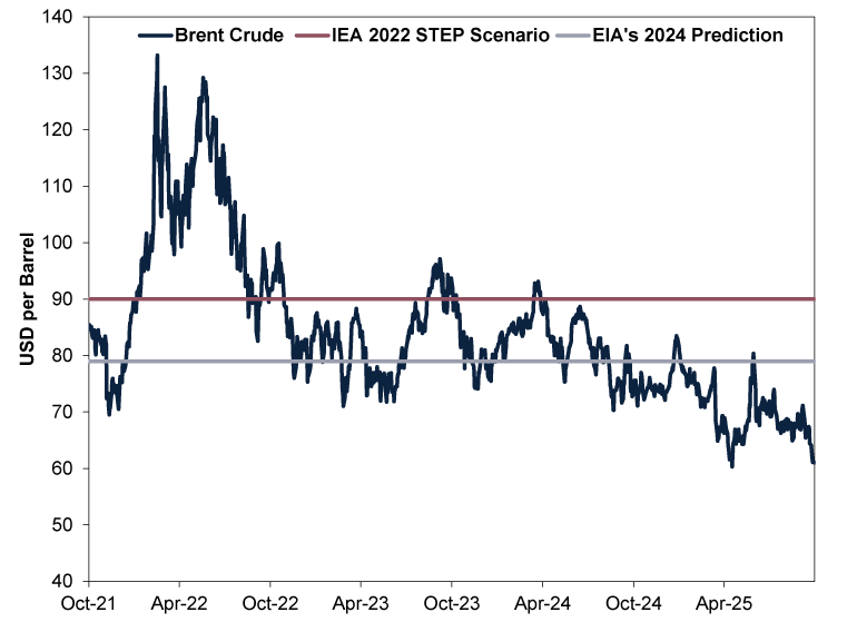 Source: FactSet, IEA and EIA, as of 21/10/2025. Brent crude oil price, 21/10/2021 – 20/10/2025. IEA’s STEP scenario is an estimate of global crude oil price based on governments’ current energy policies.