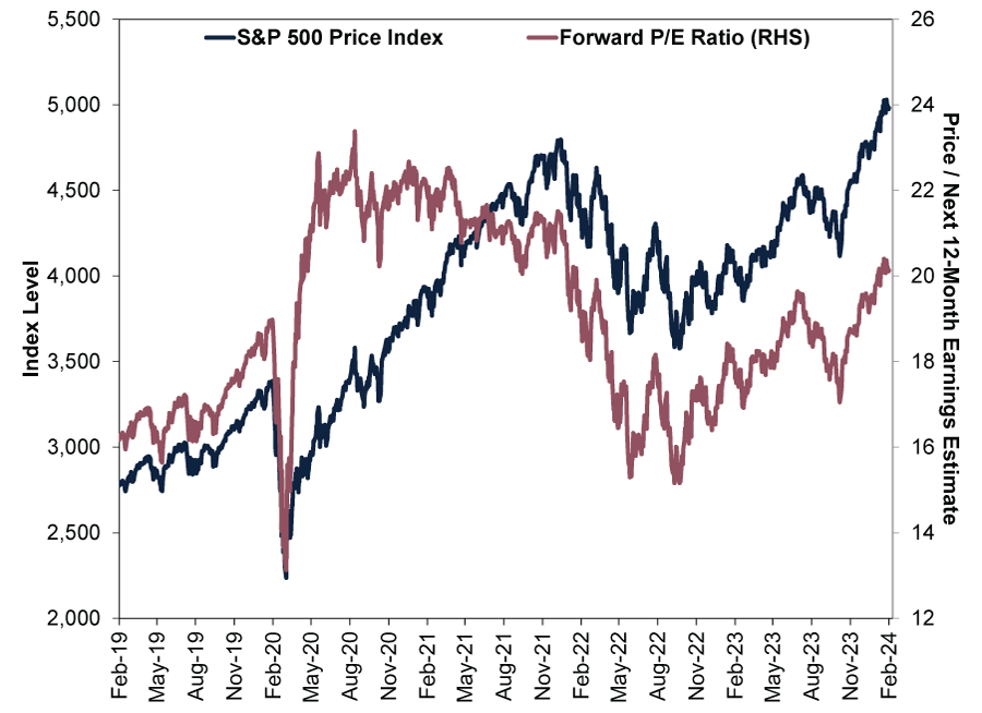 Source: FactSet, as of 22/2/2024. S&P 500 price index and 12-month forward P/E ratio, 21/2/2019 – 21/2/2024. Presented in US dollars. Currency fluctuations between the pound and dollar may result in higher or lower investment returns.
