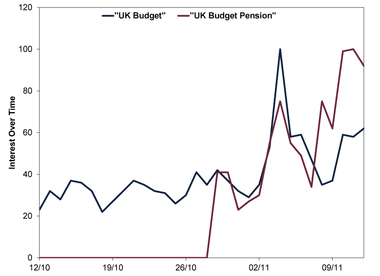 Perhaps you think headlines don’t reflect regular folks’ concerns. Fair enough. But there are other ways to track interest. For example, The Telegraph’s article last Friday on possible pension tax changes garnered over 3800 reader comments as of Wednesday evening GMT, trouncing the 510 comments across four articles featured in the paper’s “Must Reads” sidebar in the Money section.[xxxiv] In industry terminology, that is outstanding engagement, especially considering The Telegraph’s articles are behind a subscription paywall. Moreover, interest in UK Budget issues has picked up this month if Google search engine trends are any indication. (Exhibit 1)