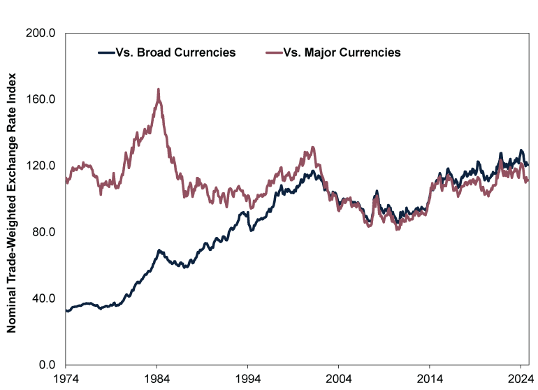 Source: FactSet, as of 8/10/2025. Nominal trade-weighted US dollar index (broad and major), monthly, 31/12/1974 – 30/9/2025.