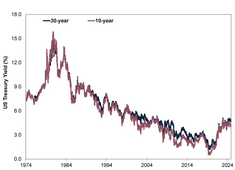 Source: FactSet, as of 8/10/2025. 30-Year and 10-Year US Treasury yield, constant maturity, daily, 31/12/1974 – 7/10/2025. Note: The US government reintroduced 30-year bonds in 1977, so there is no data from 1975 – 1976.