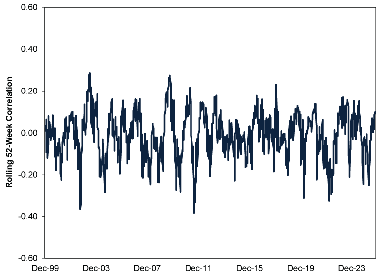 Source: FactSet, as of 8/10/2025. Rolling 52-week correlation between weekly price changes in gold and S&P 500, 31/12/1999 – 7/10/2025. Presented in US dollars. Currency fluctuations between the dollar and pound may result in higher or lower investment returns.