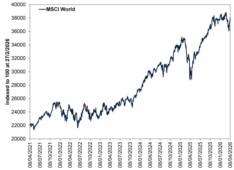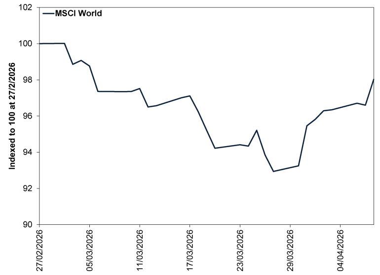 Source: FactSet, as of 8/4/2026. MSCI World Index return with net dividends in GBP, 27/2/2026 – 8/4/2026. Indexed to 100 at 27/2/2026. See annex for longer return history.