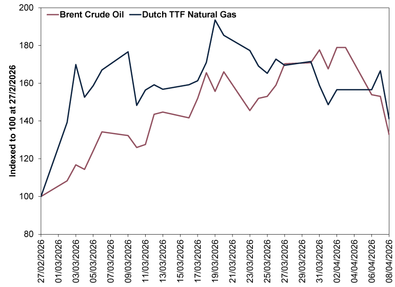 Source: FactSet, as of 8/4/2026. Brent crude oil price in dollars and Dutch TTF natural gas price in euros, 27/2/2026 – 8/4/2026. Indexed to 100 at 27/2/2026.