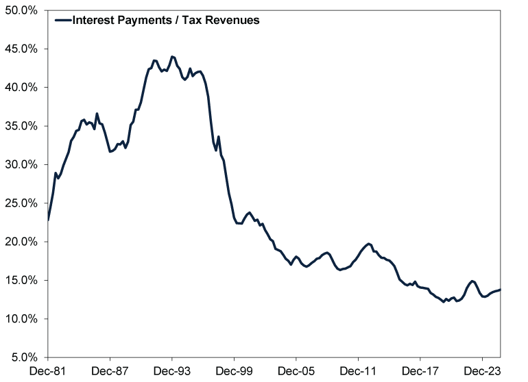 As tumultuous politics faded into the background, Italy’s better-than-anticipated fundamentals seemingly became more apparent to investors. Italian gross domestic product (GDP, a government-produced measure of economic output) has chugged along, contributing to the region’s growth.[xii] Long-running debt sustainability fears have also quieted. Despite carrying a large public debt load, Italy’s interest payments are quite affordable, especially from a historical perspective. (Exhibit 1) Perhaps most telling: We have read economic observers herald Italy’s success story as an example for the rest of Europe to follow—illustrative of sentiment’s improvement following years of political turmoil.