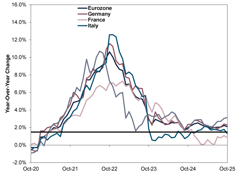 Source: FactSet, as of 3/11/2025. Year-over-year change in Harmonised Index of Consumer Prices (HICP) for the eurozone, Germany, France, Italy and Spain, October 2020 – October 2025. “Eurozone Long-Term Average” based on monthly year-over-year change in the eurozone’s HICP from October 2005 – December 2019 (to remove pandemic-driven skew).