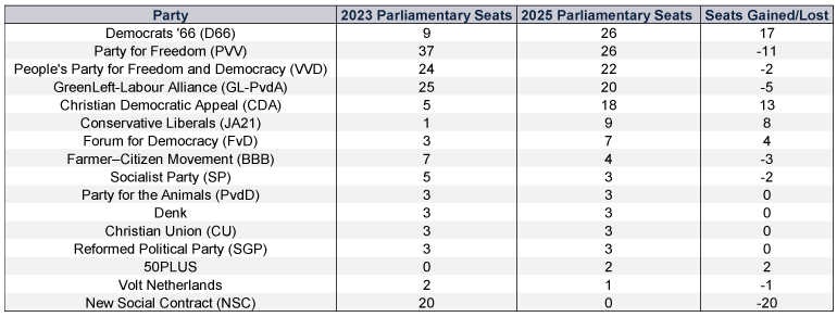 Looking ahead, D66’s popular vote plurality hands the official coalition-forming mandate to leader Rob Jetten. D66 has partnered with four separate Dutch coalitions since its 1973 inception, most recently teaming up with the conservative-liberal People’s Party for Freedom and Democracy (VVD) and former PM Mark Rutte, the Christian Democratic Appeal (CDA) and the centrist Christian Union (CU) from 2017 – 2023.[iii] In our view, this hints at D66’s most natural partners.