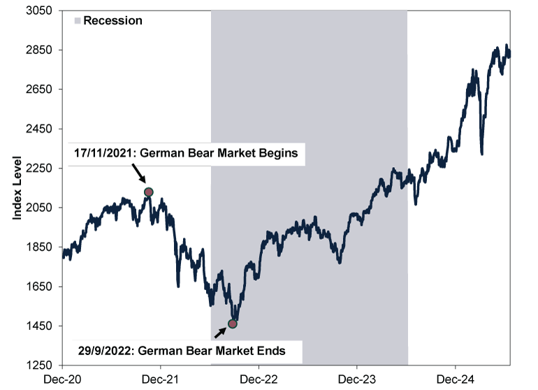 [vii] Source: FactSet, as of 21/1/2026. MSCI Germany IMI returns with gross dividends, 17/11/2021 – 29/9/2022. Presented in euros. Currency fluctuations between the euro and pound may result in higher or lower investment returns. A bear market is a typically prolonged, fundamentally driven, broad equity market decline of -20% or worse.
