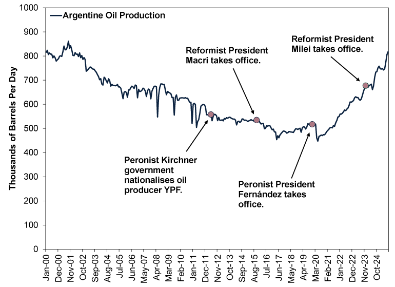 Source: FactSet, as of 5/1/2026. Monthly Argentine oil production, January 2000 – August 2025 (latest available).