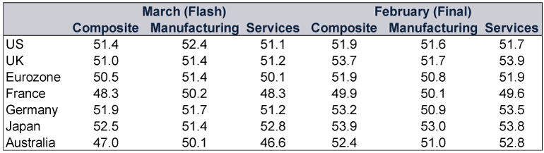 March’s results appear mixed to us. Most composite PMIs—which combine services and manufacturing—moderated from February but remained in expansion, indicating the majority of respondents in the developed world kept growing amidst the chaos. Only France and Australia contracted, with the former’s weak patch predating the war.[i]