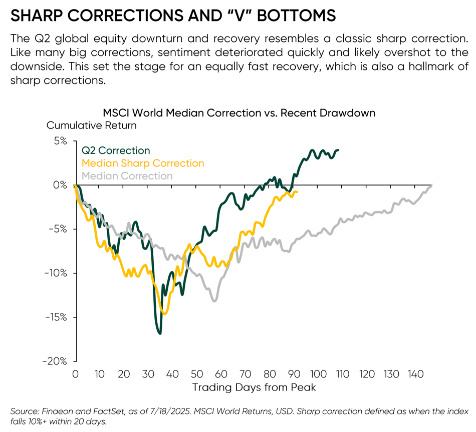 The Q2 equity market downturn reset investor sentiment lower even as markets recovered and hit new highs. Falling uncertainty on economic issues like tariffs and taxes is proving more important to investors than tariff or tax levels, and corporations are proving adept at navigating tariff volatility. Cyclical value stocks should benefit from this increasing economic confidence, while growth stocks likely face headwinds from high expectations.