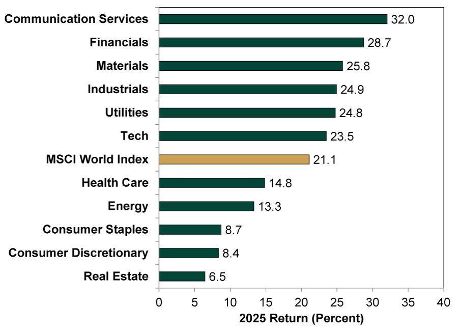 Source: FactSet, as of 1/7/2026. MSCI World Index and sector returns with net dividends, 12/31/2024 – 12/31/2025.