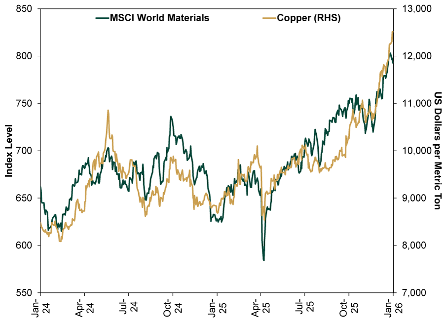 The Materials sector was also less heralded. Traditionally, Materials benefits from underlying commodity strength. As Exhibit 2 shows, its returns happen to be closely connected to copper prices. Not because copper is uniquely indicative per se, but because it is usually correlated with metals prices in general—while Metals & Mining companies form the largest group within the sector.