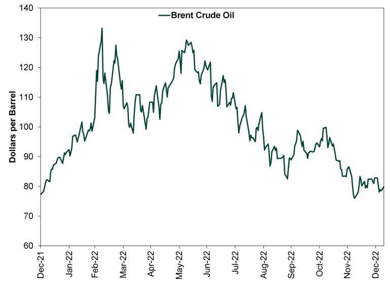 Source: FactSet, as of 1/10/2023. Brent crude oil spot price, 12/31/2021 – 1/9/2023.
