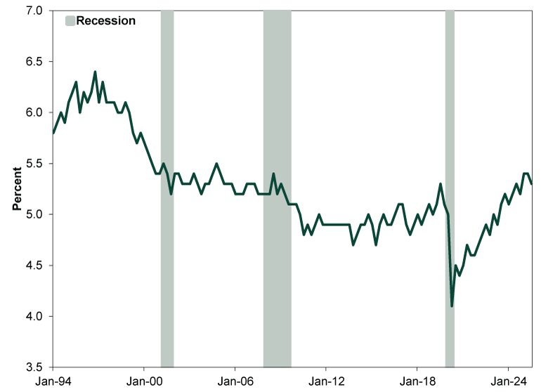 Source: St. Louis Federal Reserve, as of 1/13/2026. Multiple jobholders as a percent of employed, seasonally adjusted, quarterly, Q1 1994 – Q3 2025.