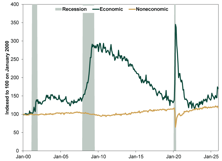Now, it is true those working part time for economic reasons (which the BLS categorizes as “involuntary part-time workers” who cannot find full-time employment despite saying they want it) has been rising since 2023, a contrast with recent past economic cycles. (Exhibit 2). Notably, the number of folks working part time for noneconomic reasons has remained generally steady. This is interesting—and it isn’t about people picking up work due to cost-of-living issues. Those would be categorized as noneconomic. Counterintuitive as that may seem, the defining feature of “economic reasons” is they are people who wanted full-time work but couldn’t get it because the labor market was weak.