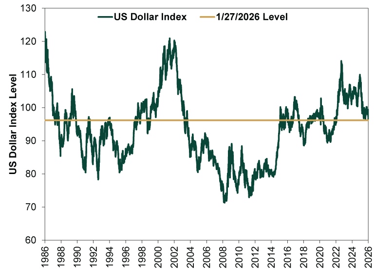 Source: FactSet, as of 1/28/2026. US Dollar Index, 1/27/1986 – 1/27/2026.