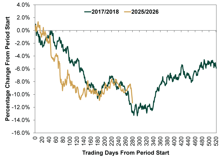 Source: FactSet, as of 1/28/2026. Periods covered are 12/31/2016 – 12/31/2018 and 12/31/2024 – 1/27/2026.