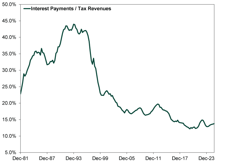 As tumultuous politics faded into the background, Italy’s better-than-feared fundamentals became more apparent to investors. Italian GDP has chugged along, contributing to the region’s growth. Long-running debt sustainability fears have also quieted. Despite carrying a large public debt load, Italy’s interest payments are quite affordable, especially from a historical perspective. (Exhibit 1) Perhaps most telling: Some experts now herald Italy’s success story as an example for the rest of Europe to follow—illustrative of sentiment’s improvement following years of political turmoil.