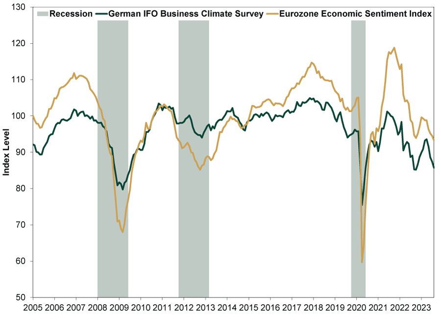 Source: FactSet, as of 9/12/2023. Recession shading based on Euro Area Business Cycle Network dates.