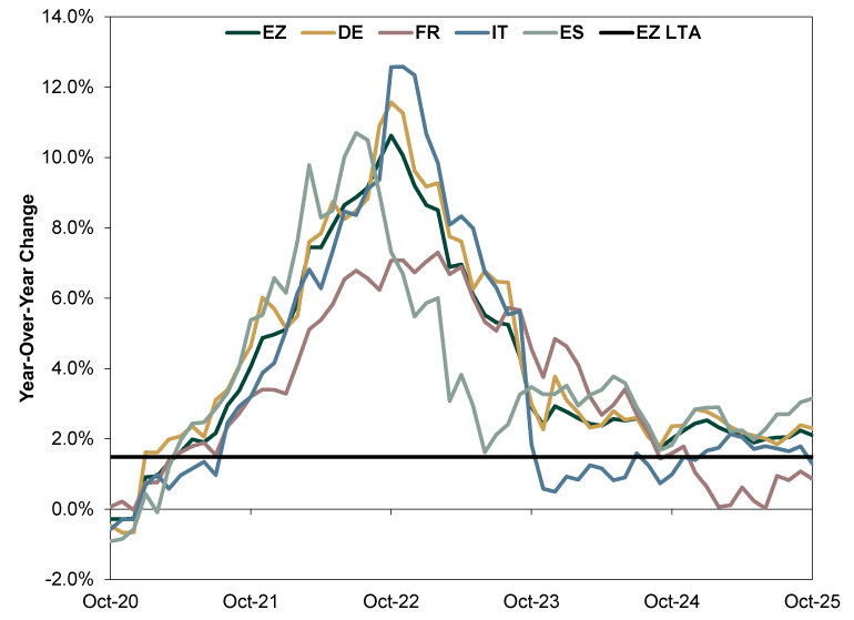 Source: FactSet, as of 11/3/2025. Year-over-year change in Harmonized Index of Consumer Prices (HICP) for the eurozone, Germany, France, Italy and Spain, October 2020 – October 2025. “Eurozone Long-Term Average” based on monthly year-over-year change in the eurozone’s HICP from October 2005 – December 2019 (to remove pandemic-driven skew).