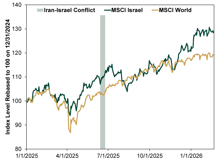 Source: FactSet, as of 2/19/2026. MSCI Israel and World price indexes, 12/31/2024 – 2/19/2026.