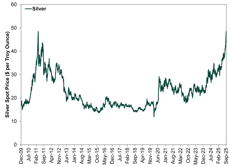 Source: FactSet, as of 10/8/2025. Silver spot price (New York), 12/31/2009 – 10/7/2025.