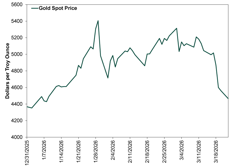 Source: FactSet, as of 3/23/2026. Gold spot price, 12/31/2025 – 3/23/2026.