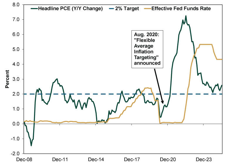 Source: FactSet and St. Louis Federal Reserve, as of 8/27/2025. US PCE Price Index, year-over-year change, and Federal Funds Effective Rate, December 2008 – June 2025.