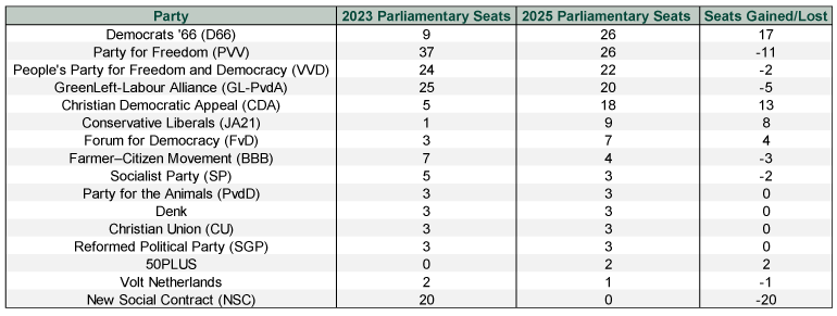 Looking ahead, D66’s popular vote plurality hands the official coalition-forming mandate to leader Rob Jetten. D66 has partnered with four separate Dutch coalitions since its 1973 inception, most recently teaming up with the conservative-liberal People's Party for Freedom and Democracy (VVD) and former PM Mark Rutte, the Christian Democratic Appeal (CDA) and the centrist Christian Union (CU) from 2017 – 2023. This hints at the most natural partners.