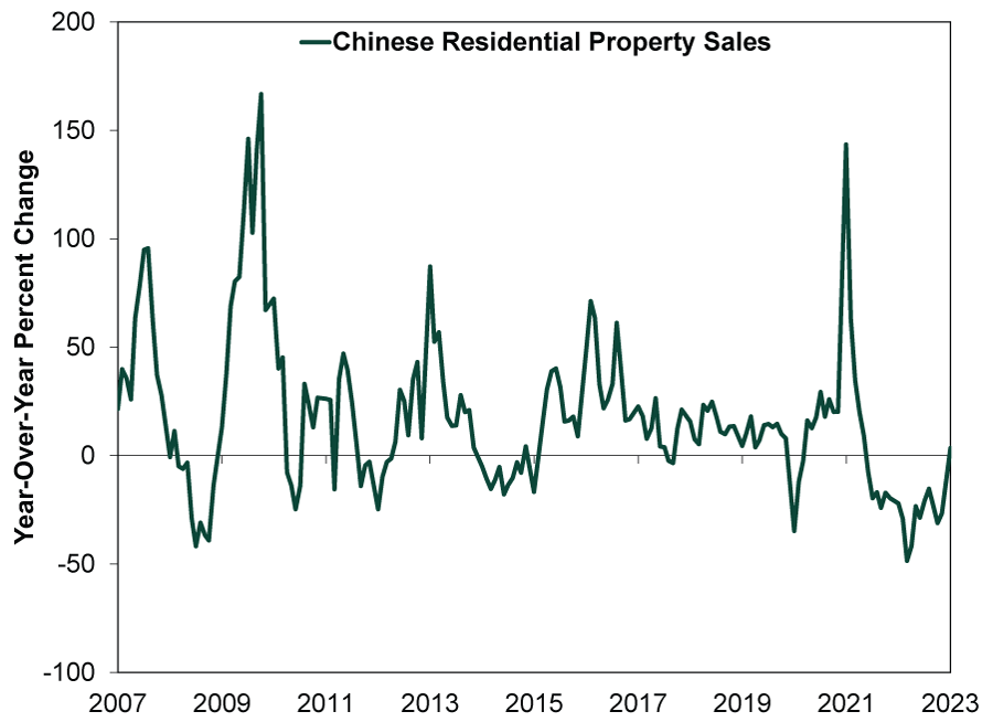 Chinese real estate activity cratered last year, after Chinese property developers’ longstanding debt woes came to a head starting in late 2021. Annual property sales by floor area fell -24% in 2022.[i] Property investment declined -10%, while construction starts dropped -39%. Many expected the carnage to continue in 2023, but the decline has slowed substantially, suggesting the worst may have passed. In January-February, property investment’s contraction eased to -5.7% y/y, and new construction fell a milder -9.4%. (China combines the first two months’ data to reduce Lunar New Year holiday skew.)