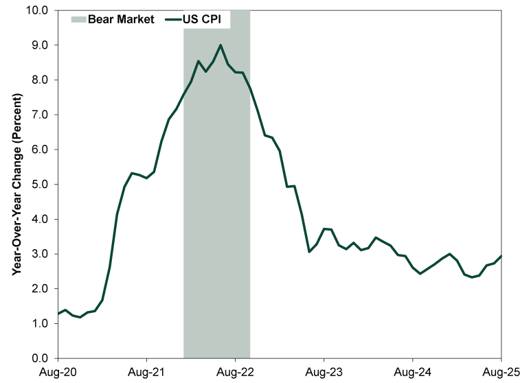 Source: FactSet, as of 10/13/2025. US CPI, year-over-year change, and MSCI World Index returns with net dividends, January 2022 – August 2025.