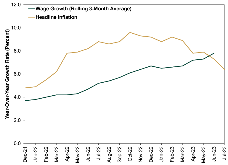 Source: FactSet, as of 8/16/2023. Average weekly earnings excluding bonuses (rolling 3-month average) and CPI including owner-occupiers’ housing costs, year-over-year changes, December 2021 – July 2023. Wage growth data run through June 2023.