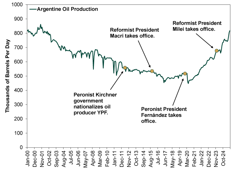 Source: FactSet, as of 1/5/2026. Monthly Argentine oil production, January 2000 – August 2025 (latest available).