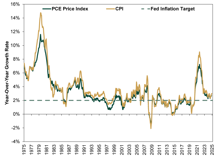 Source: Bureau of Economic Analysis and BLS, as of 10/24/2025. PCE Price Index, October 1975 – August 2025, and CPI, October 1975 – September 2025.