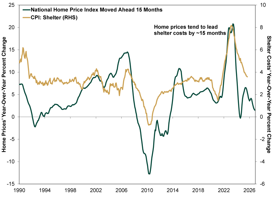 Source: FactSet, as of 10/24/2025. S&P/Case-Shiller National Home Price Index, January 1990 – August 2025, and CPI: Shelter, January 1990 – September 2025. We advanced the Home Price Index 15 months for illustrative purposes.