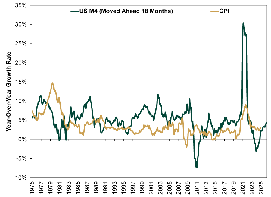 Source: Center for Financial Stability and BLS, as of 10/24/2025. Divisia M4 (including US Treasurys), October 1975 – August 2025, and CPI, October 1975 – September 2025. We advanced M4 18 months for illustrative purposes.