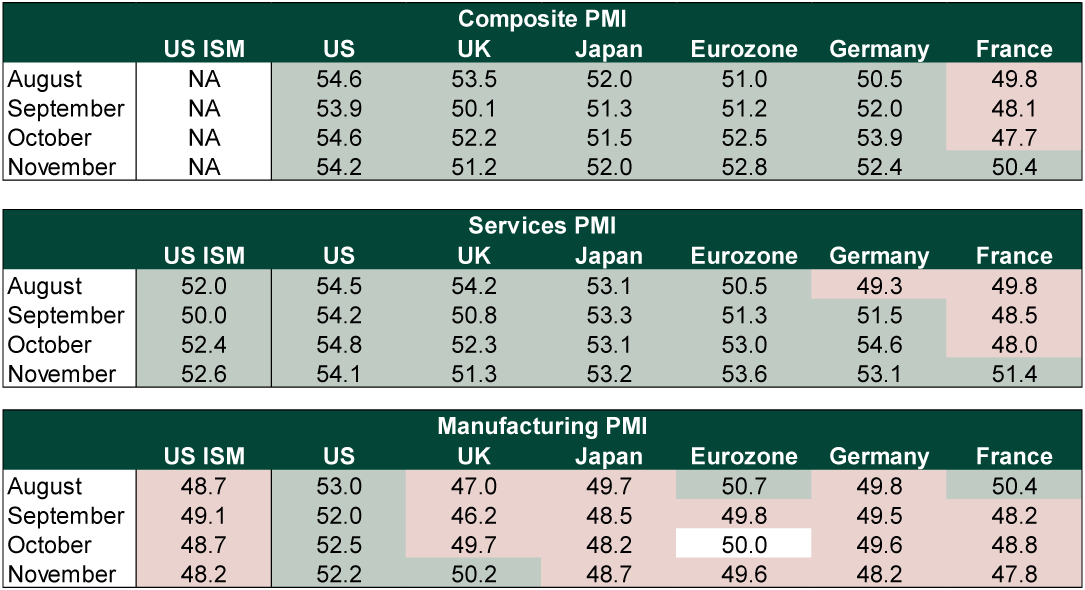 Source: FactSet, as of 12/3/2025. All figures are S&P Global PMIs except the Institute for Supply Management’s US figures.