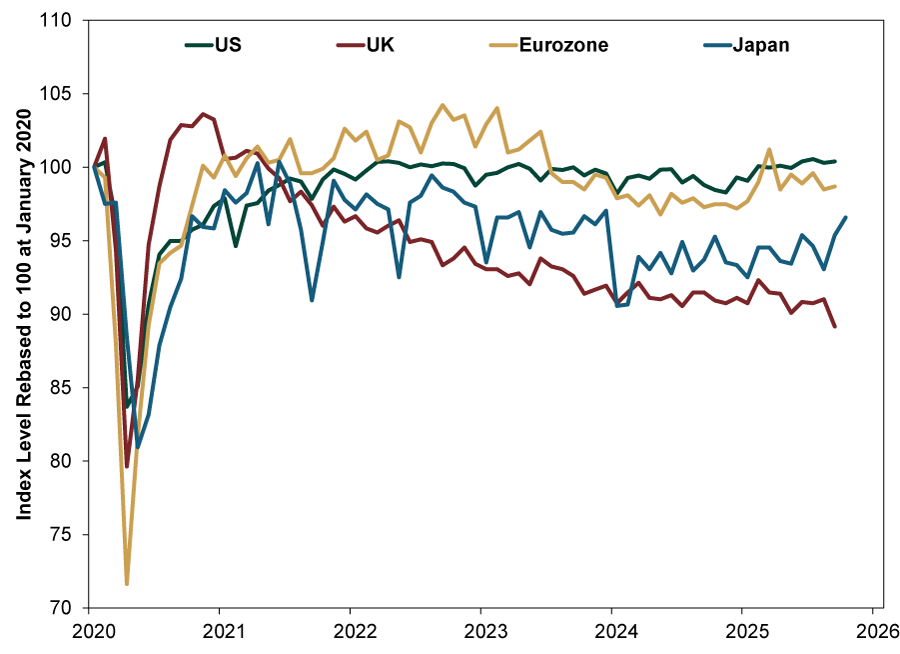 Source: FactSet, as of 12/3/2025. US, UK and eurozone industrial production, January 2020 – September 2025, Japan industrial production, January 2020 – October 2025.