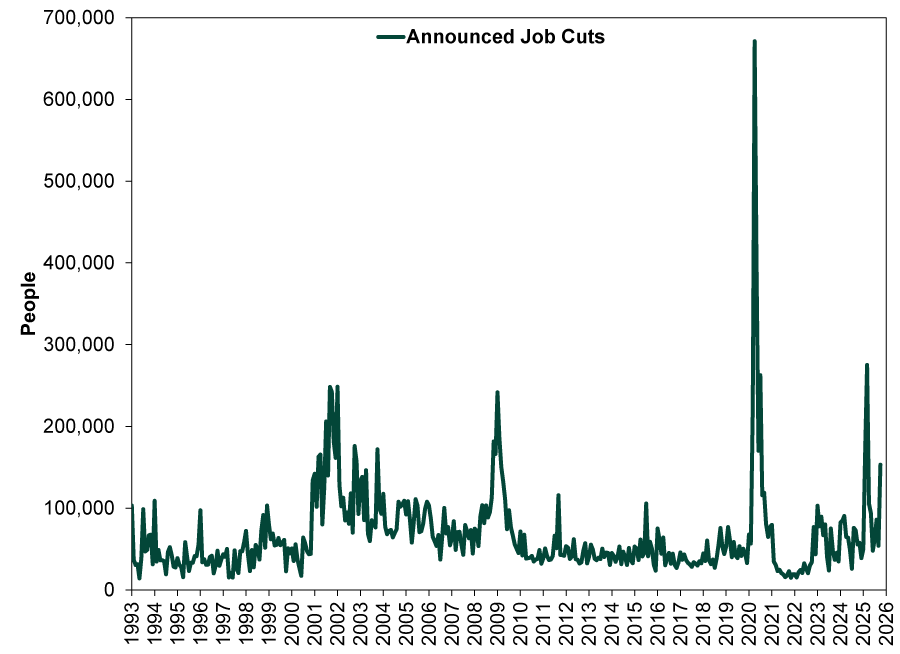 Source: FactSet, as of 11/7/2025. Challenger, Gray & Christmas Announced Layoffs, January 1993 – October 2025.