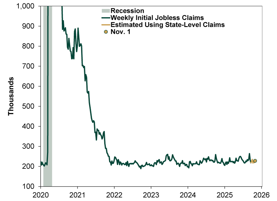 Source: Federal Reserve Bank of St. Louis and Department of Labor (DoL), as of 11/7/2025. Weekly initial jobless claims, 1/6/1968 – 9/20/2025, and Bloomberg estimates based on downloadable DoL state-level claims, 9/20/2025 – 11/1/2025. Y-axis truncated at 1,000; claims peaked at 6.137 million on 4/4/2020—for comparison, the previous peak on 3/28/2009 topped out at 665,000.