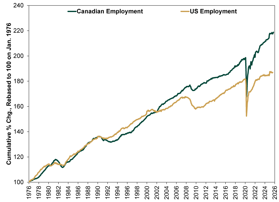 [iv] Source: FactSet, as of 11/7/2025. Canadian and US employment, January 1976 – Augst 2025 (latest US jobs report available).