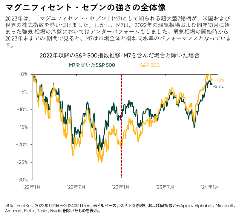 Fisher Investmentsでは、新たな強気相場サイクルが2024年も継続すると考えています。予想を上回る経済成長、堅固な企業体力、インフレ緩和、米国大統領選挙の年、といった要因は、株式市場の下支えとなるでしょう。目先はグロース株が引き続き市場を牽引すると見込まれますが、経済の再加速により2024年終盤にかけてグロース株からバリュー株への市場牽引役の交代が起きる可能性もあります。さらに、ここ1年で投資家心理は改善したものの、投資家は依然として懐疑的姿勢を維持しているため、上方サプライズ発生により好リターンが生まれる余地を大いに残しています。